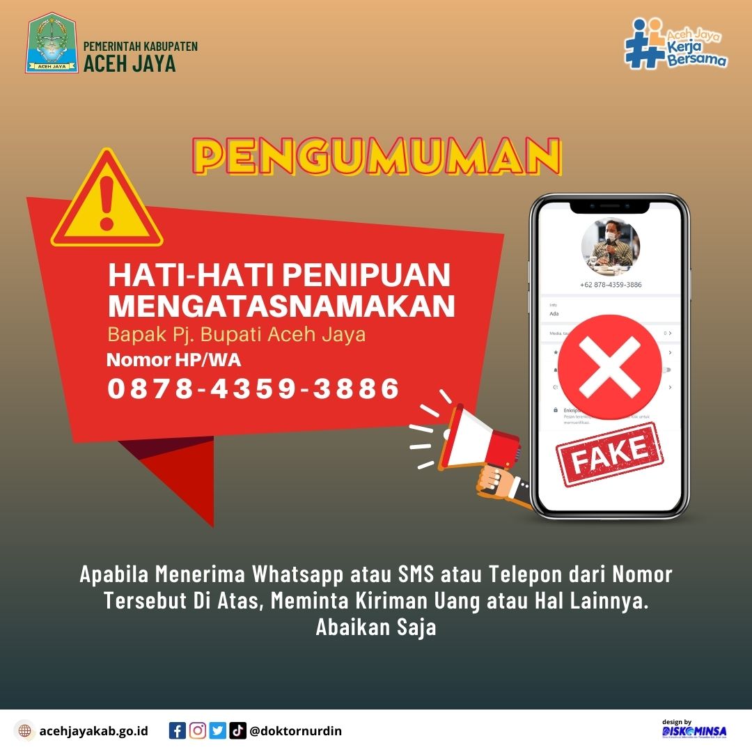 “Itu adalah tindakan penipuan, yang jelas saya sampaikan bahwa itu bukan Pj Bupati Aceh Jaya. Hati -hati dengan nomor kontak tersebut, penipuan W.A (WhatsApp) yang mengatasnamakan Bapak Pj Bupati Aceh Jaya masih terus berlanjut. Beliau tidak pernah meminta uang atau jasa apa pun,” kata Aula.