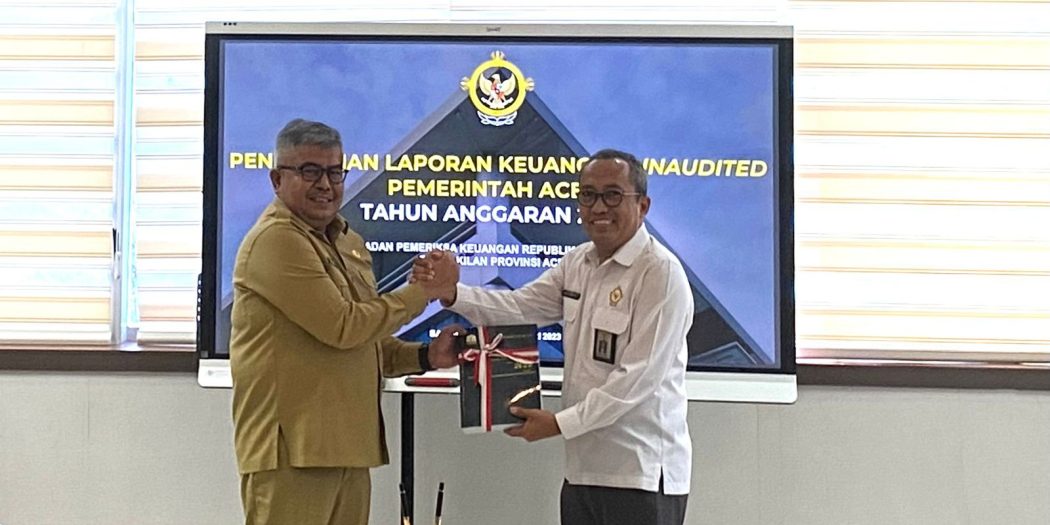 DISTORI.ID – Sekretaris Daerah (Sekda) Aceh, Bustami Hamzah, menyerahkan Laporan Keuangan Pemerintah Aceh (LKPA) Tahun Anggaran 2022 kepada Badan Pemeriksa Keuangan (BPK) Republik Indonesia Perwakilan Aceh, Senin (27/2/2023). Laporan tersebut diterima langsung Kepala BPK RI Perwakilan Aceh, Masmudi.