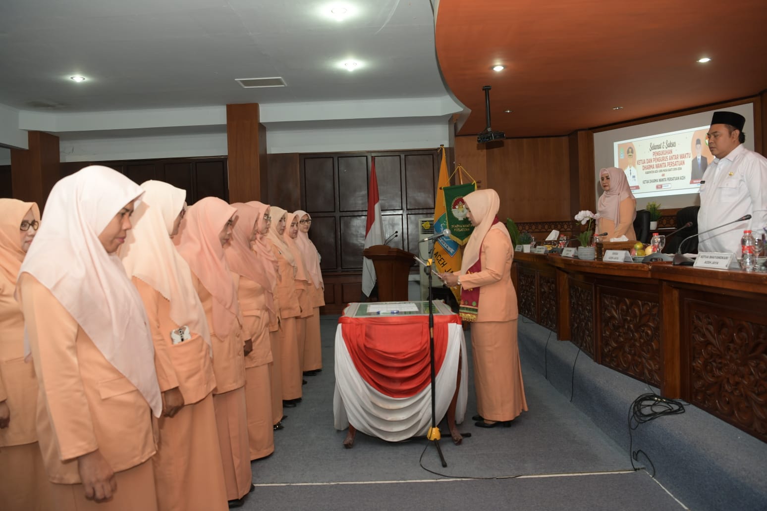 DISTORI.ID – Ketua Dharma Wanita Persatuan (DWP) Aceh, Mellani Subarni, mengukuhkan Pergantian Antar Waktu (PAW) Ketua dan Pengurus DWP Kabupaten Aceh Jaya Masa Bakti 2019- 2024, di Aula Sekretariat Daerah Kabupaten Aceh Jaya, Rabu (8/3/2023).