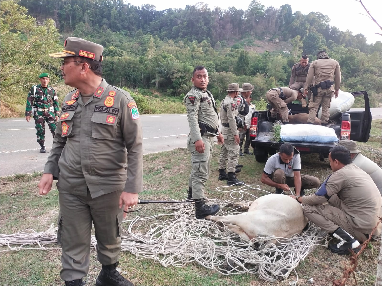 DISTORI.ID – Petugas Satpol PP bersama Tim Terpadu menertibkan ternak di sepanjang jalan nasional Banda Aceh-Meulaboh mulai dari Kota Calang Kecamatan Krueng Sabee, hingga ke Kecamatan Jaya, Kabupaten Aceh Jaya.