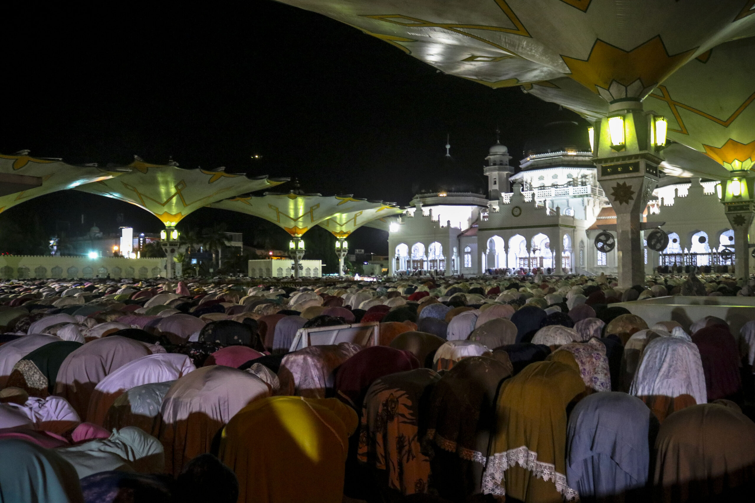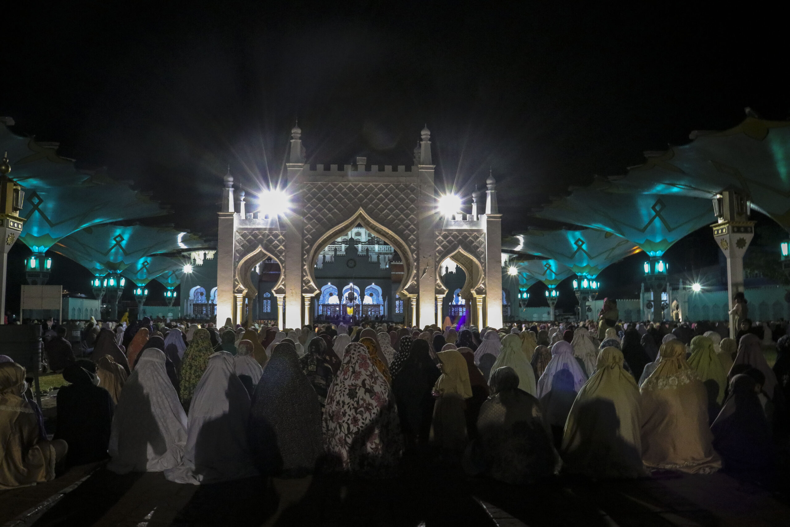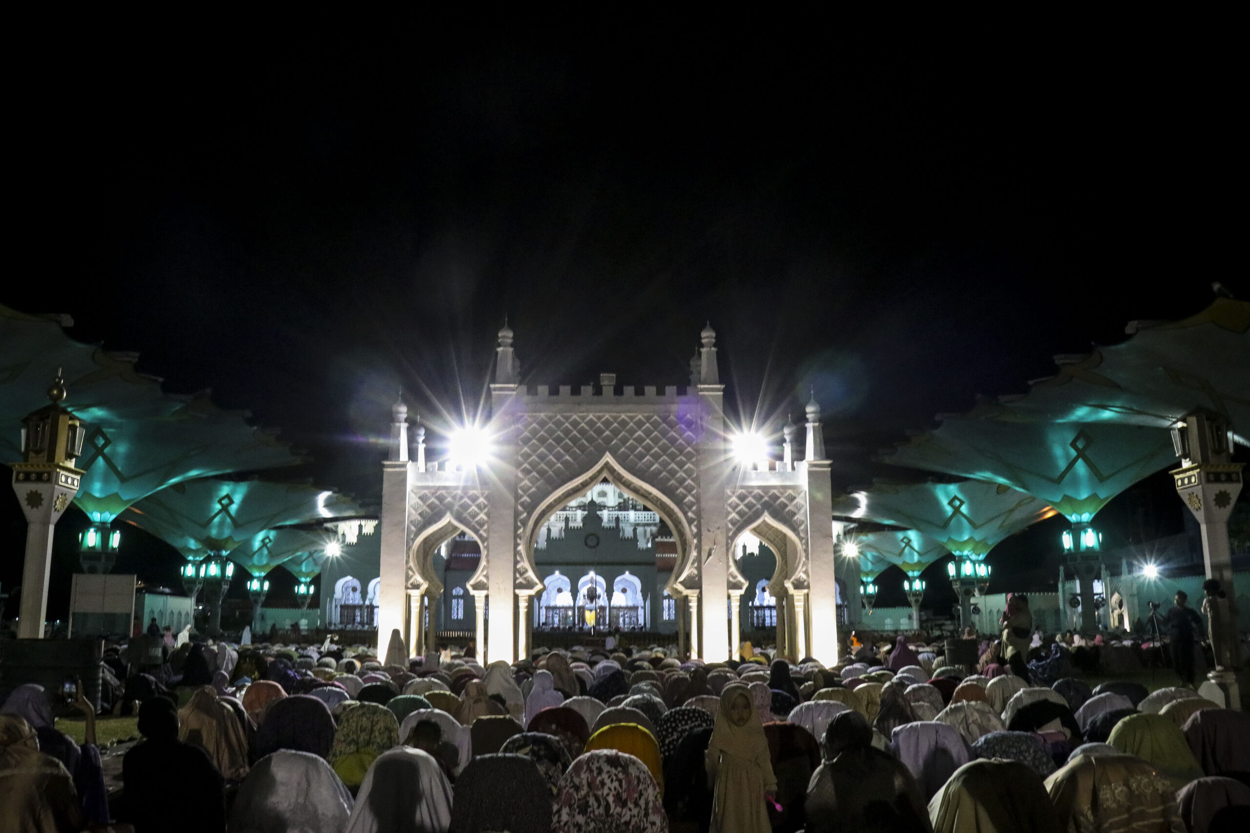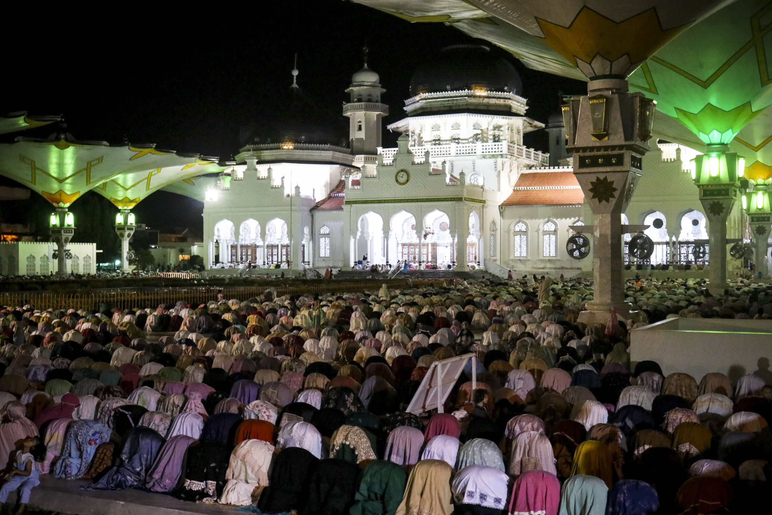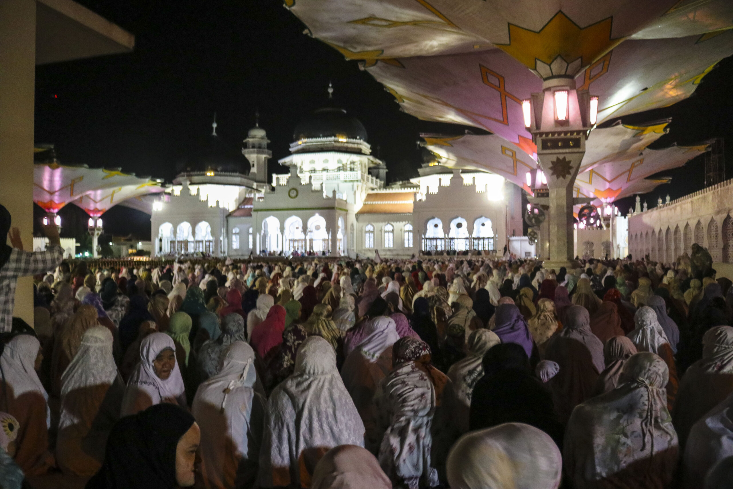 Ribuan jemaah memadati Masjid Raya Baiturrahman, Banda Aceh untuk melaksanakan ibadah salat tarawih pertama bulan ramadan 1444 Hijriah, Rabu (22/3/2023) malam. Pemerintah menetapkan jadwal puasa ramadan 1444 Hijriah/2023 jatuh pada Kamis (23/3/2023).