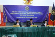 “Sesuai dengan petitum di laporan, menyatakan para Teradu telah melakukan pelanggaran terhadap ketentuan Pasal 6 ayat (3) huruf a, huruf b, Pasal 7 ayat (3), Pasal 11, Pasal 12 dan Pasal 19 Peraturan DKPP Nomor 2 Tahun 2017 tentang Kode Etik dan Pedoman Perilaku Penyelenggara Pemilihan Umum,” kata Ketua Komisi I DPR Aceh Iskandar Usman Al-Farlaky.