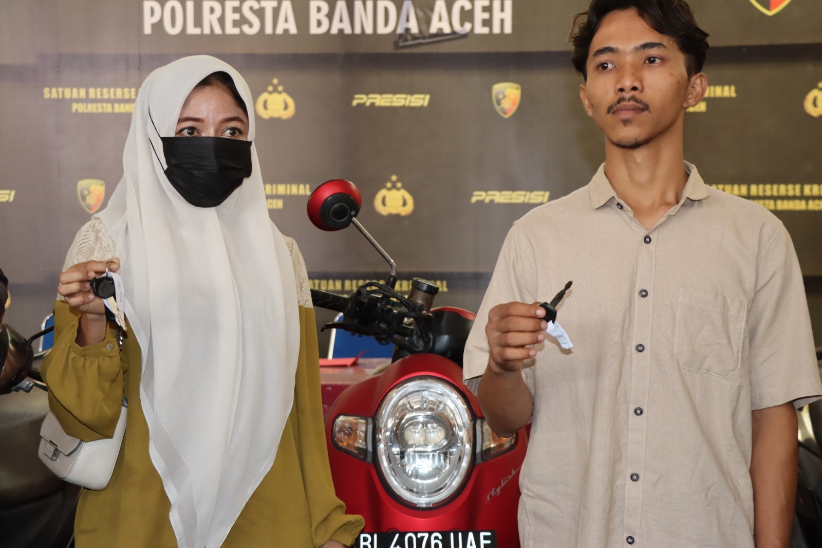 DISTORI.ID – Usai pelaksanaan konferensi pers terkait dengan hasil Operasi Sikat Seulawah 2023, Selasa (11/4/2023), Kabag Ops Kompol Iswahyudi dan Kasat Reskrim Kompol Fadillah Aditya Pratama mengembalikan motor curian kepada dua orang perwakilan pemilik motor. Ini dilakukan dengan menyerahkan kunci motor secara simbolis kepada pemiliknya.