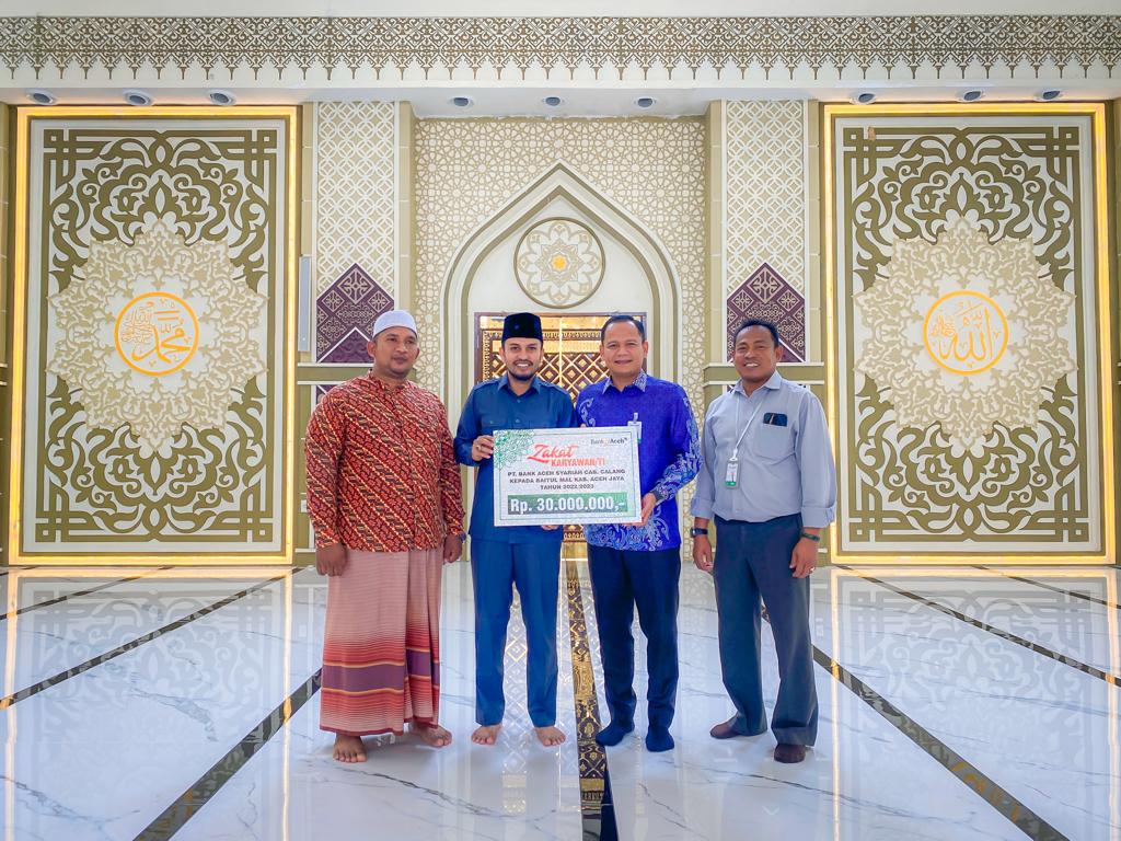 Zakat tersebut diserahkan langsung oleh kepala Cabang Bank Aceh Calang, T. M. Andika Putra yang berlangsung di Masjid Agung Baitul Izzah Kabupaten Aceh Jaya.