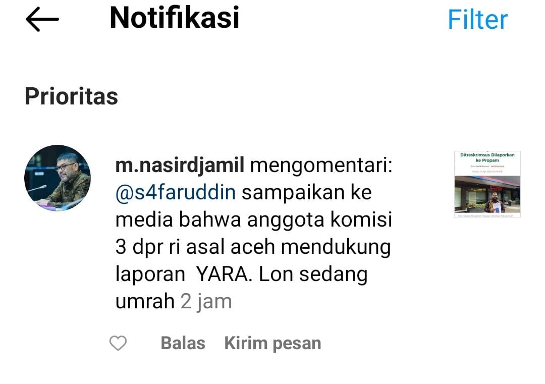 “Sampaikan ke media bahwa anggota Komisi 3 DPR RI asal Aceh mendukung laporan YARA, long sedang umroh (saya sedang umroh),” tulis Nasir Djamil di postingan akun Instagram @s4faruddin, pukul 03.00 dini hari yang sedang melaksanakan ibadah umrah di tanah suci Mekkah, Arab Saudi.
