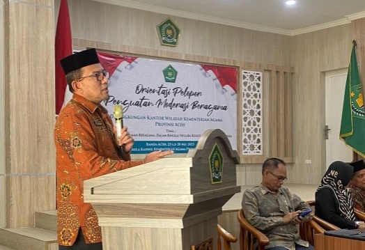 DISTORI.ID – Kepala Kantor Wilayah Kementerian Agama Provinsi Aceh, Azhari membuka secara resmi kegiatan Orientasi Pelopor Penguatan Moderasi Beragama di aula kanwil, Kamis (25/5/2023).