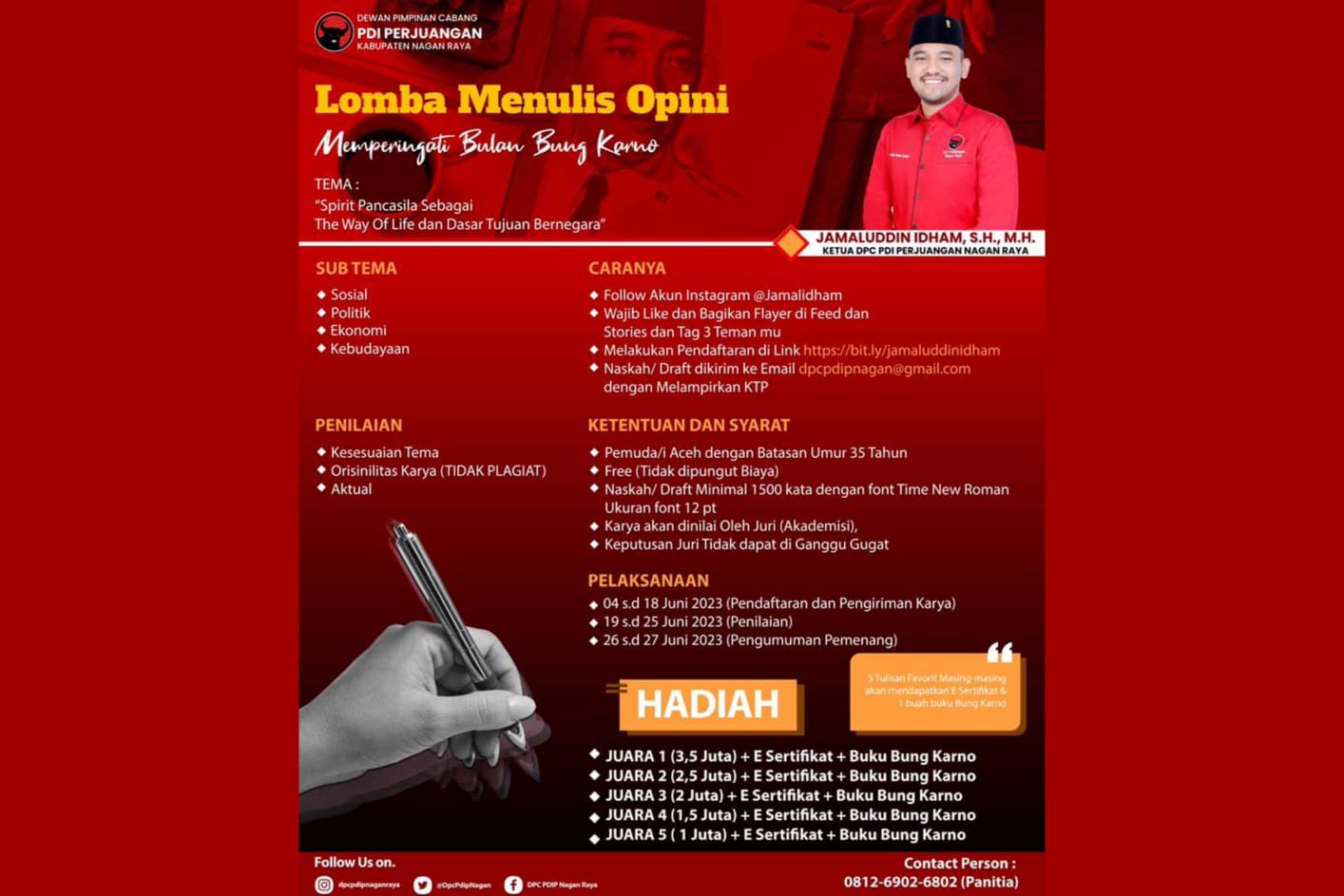 DISTORI.ID – Ketua Dewan Pimpinan Cabang (DPC) Partai Demokrasi Indonesia Perjuangan (PDIP) Nagan Raya, Jamaluddin Idham mengelar lomba menulis opini memperingati bulan Bung Karno.