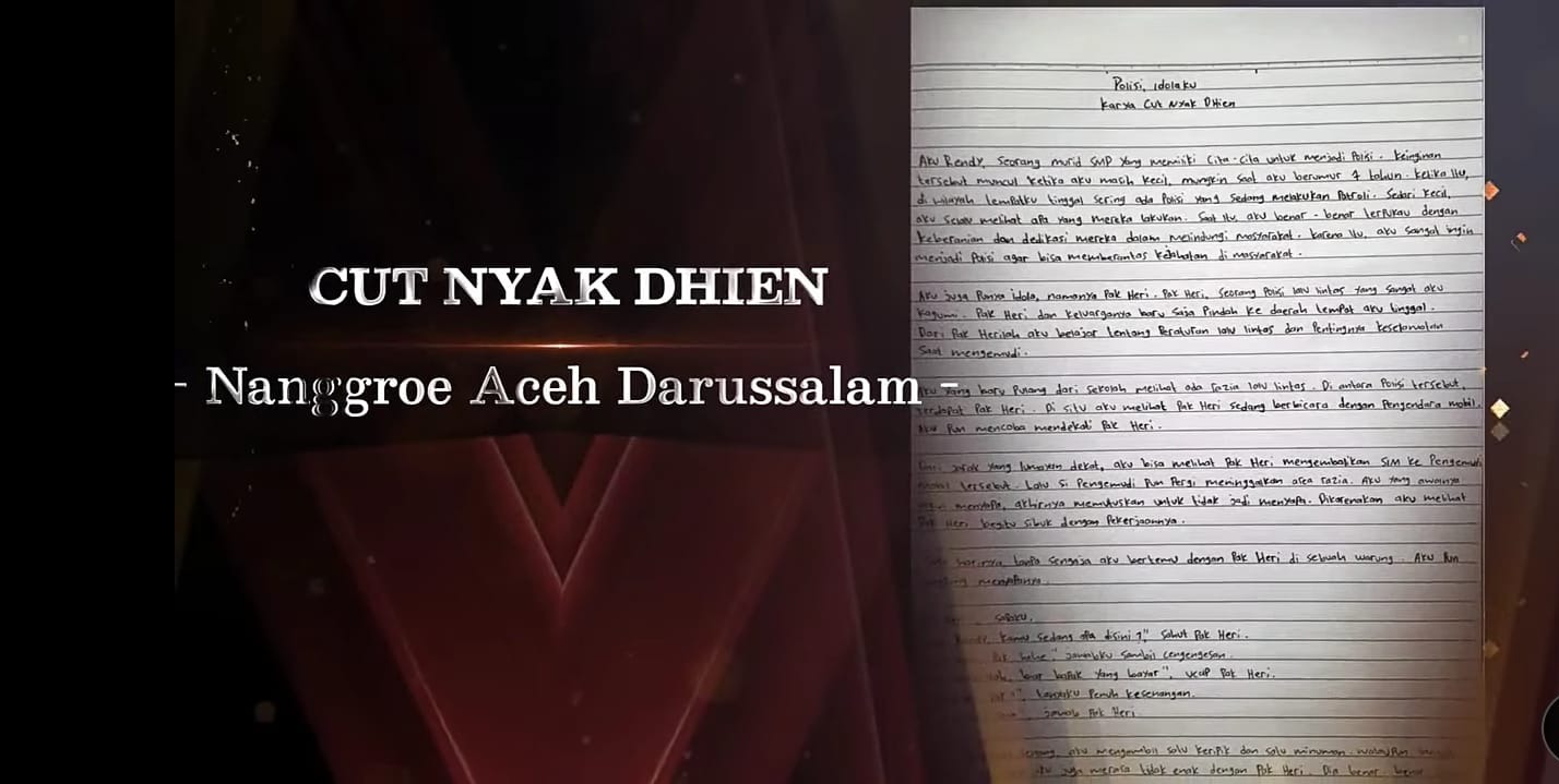 “Alhamdulillah ada satu peserta dari Aceh yang menang lomba di tingkat Mabes atas nama Cut Nyak Dhien. Dia menulis cerpen dengan judul ‘Polisi Idolaku’,” kata Joko, dalam rilisnya, Rabu (21/6/2023).
