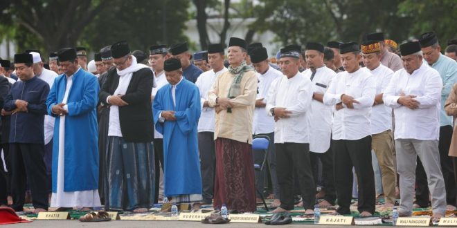 DISTORI.ID – Penjabat (Pj) Gubernur Aceh Achmad Marzuki, bersama Sekretaris Daerah (Sekda) Aceh Bustami Hamzah, melaksanakan salat Iduladha 1444 Hijriah, bersama ribuan jemaah di Lapangan Blang Padang, Kamis (29/6/2023) pagi.