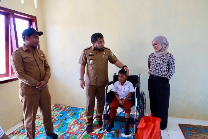 DISTORI.ID – Penjabat (Pj) Bupati Aceh Besar Muhammad Iswanto menyerahkan bantuan tiga unit kursi roda, bersumber dari Kementerian Sosial (Kemensos) RI melalui Risa Noviadi.