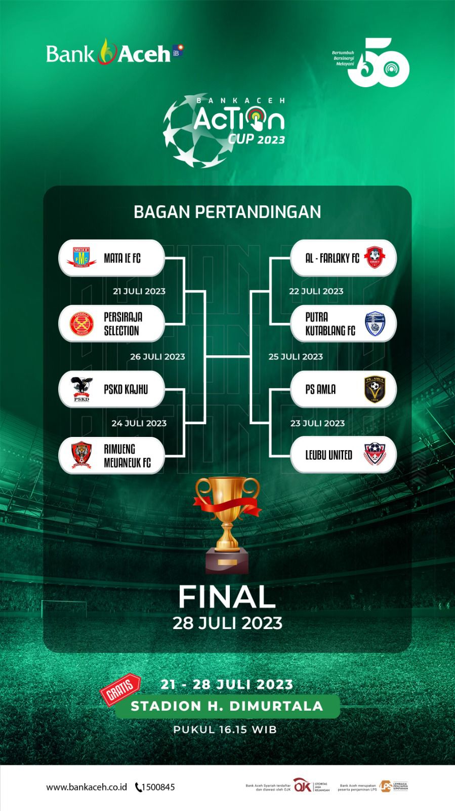 Turnamen Bank Aceh Action Cup Tahun 2023 akan digelar mulai 21-28 Juli 2023 di Stadion H. Dimurthala, Banda Aceh, memperebutkan total hadiah Rp200 juta.
