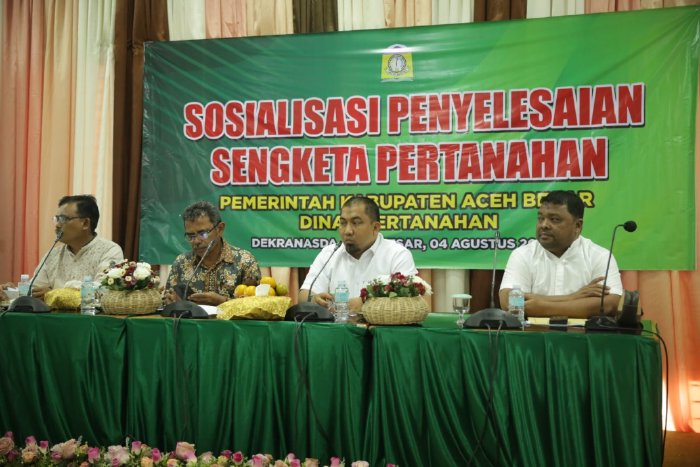 DISTORI.ID – Penjabat (Pj) Bupati Aceh Besar Muhammad Iswanto didampingi Sekretaris Daerah Sulaimi membuka secara resmi sosialisasi penyelesaian sengketa pertanahan di wilayah hukum Kabupaten Aceh Besar di Aula Dekranasda Aceh Besar, Gampong Gani, Kecamatan Ingin Jaya, Aceh Besar, Jumat (4/8/2023).