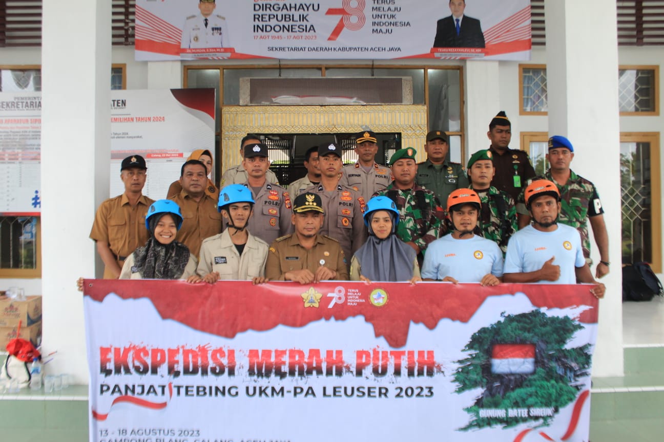 DISTORI.ID – Penjabat Bupati Aceh Jaya, Nurdin, menyerahkan bendera Merah Putih raksasa kepada Tim Expedisi Mapala Leuser Universitas Syiah Kuala (USK). Kegiatan berlangsung di halaman kantor bupati setempat, Senin (14/8/2023).