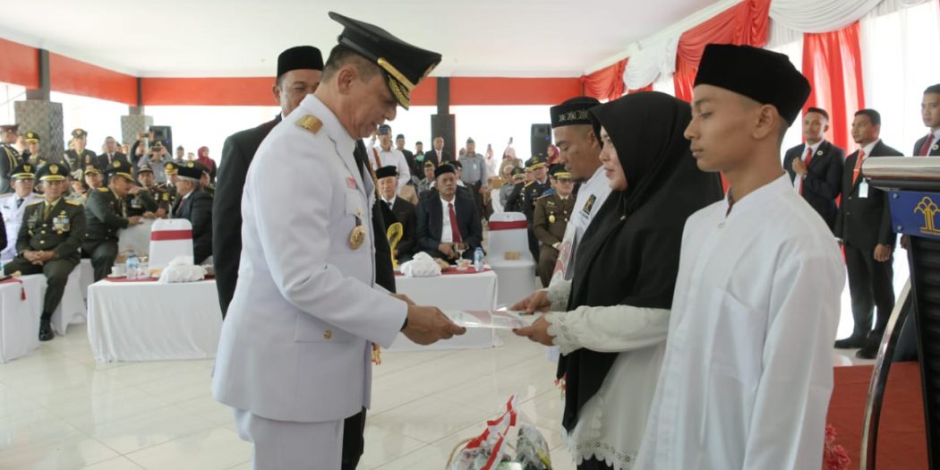 DISTORI.ID – Penjabat Gubernur Aceh Achmad Marzuki, didampingi Plh Kanwil Kemenkumham Aceh Lilik Sujandi, menyerahkan Surat Keputusan Remisi Umum secara simbolik kepada tiga Warga Binaan Pemasyarakatan di Lembaga Pemasyarakatan Kelas II Banda Aceh, Kamis (17/8/2023).