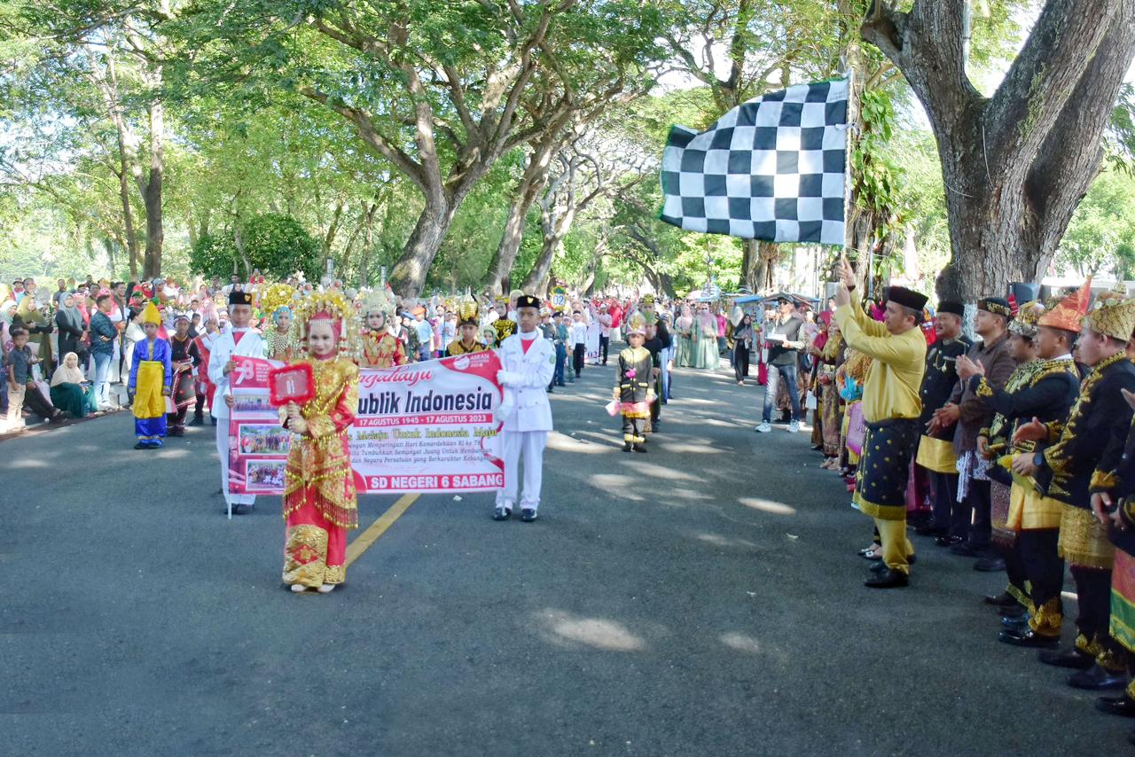 Karnaval budaya dilepas secara langsung oleh Pj Wali Kota Sabang Reza Fahlevi bersama Forkopimda, di depan Kantor Wali Kota Sabang, Sabtu (19/8/2023).