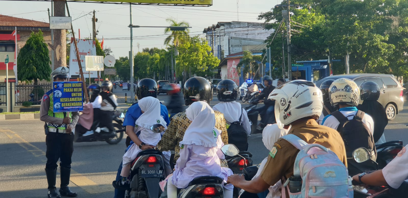 DISTORI.ID – Satlantas Polresta Banda Aceh melakukan sosialisasi dan imbauan kepada pengendara sepeda motor untuk taat menggunakan helm. Kegiatan tersebut digelar di beberapa titik rawan kecelakaan.
