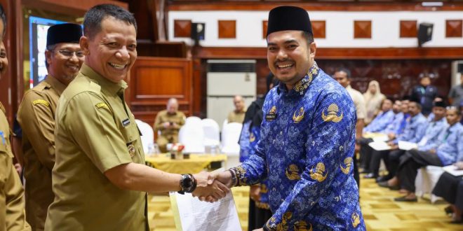 DISTORI.ID – Penjabat Gubernur Aceh Achmad Marzuki, menyerahkan serentak secara digital surat keputusan (SK) pensiun dan kenaikan pangkat untuk 3.360 pegawai negeri sipil (PNS) di seluruh Aceh.