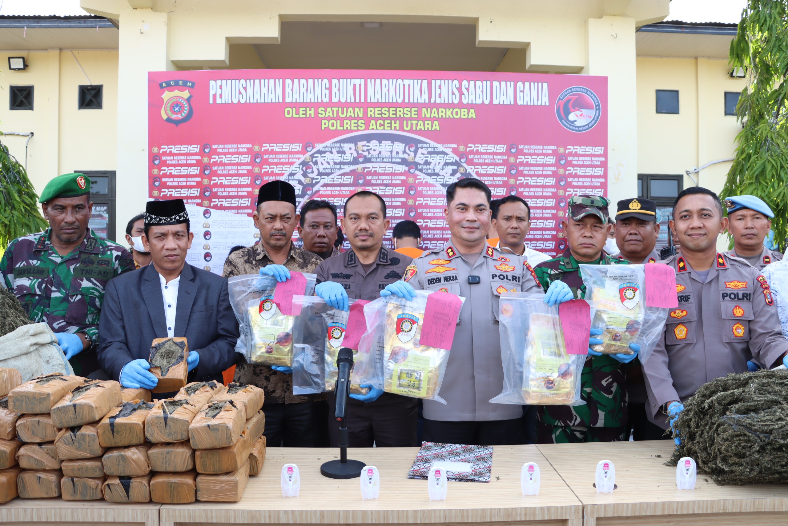 DISTORI.ID – Polres Aceh Utara memusnahkan barang bukti narkotika jenis sabu dan ganja dengan berat total 65,5 kilogram atau senilai Rp3,65 miliar. Pemusnahan dilakukan di halaman Mapolres setempat, Kamis (12/10/2023).