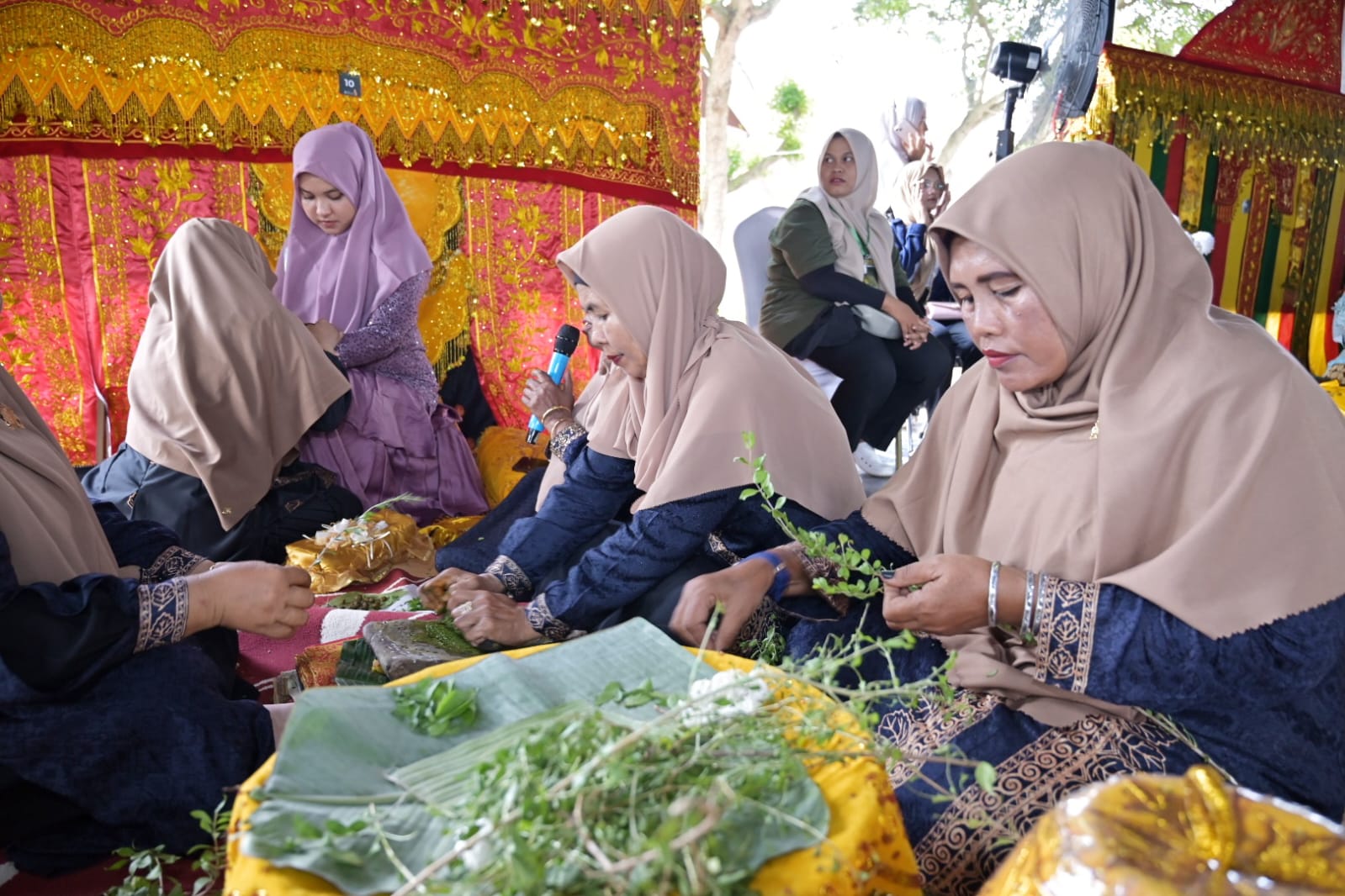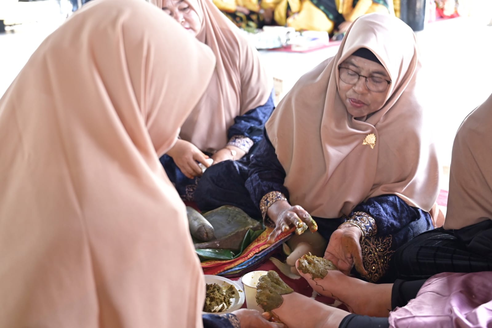 PESERTA dari Kabupaten Aceh Jaya mengikuti lomba prosesi adat Boh Gaca (memakai inai) pada Pekan Kebudayaan Aceh (PKA) ke-8 di Museum Aceh, Banda Aceh, Aceh, Selasa (7/11/2023).