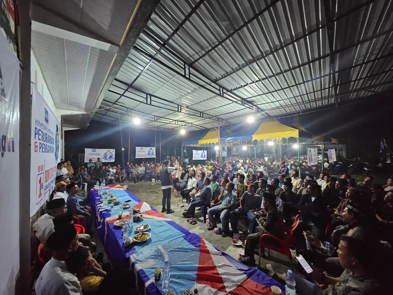 Ratusan masyarakat tampak antusias menghadiri silaturahmi dengan Caleg Dapil 9 yang juga Ketua DPC Partai Demokrat Abdya periode-2022-2027 ini Romi Syah Putra meski diguyur hujan deras.