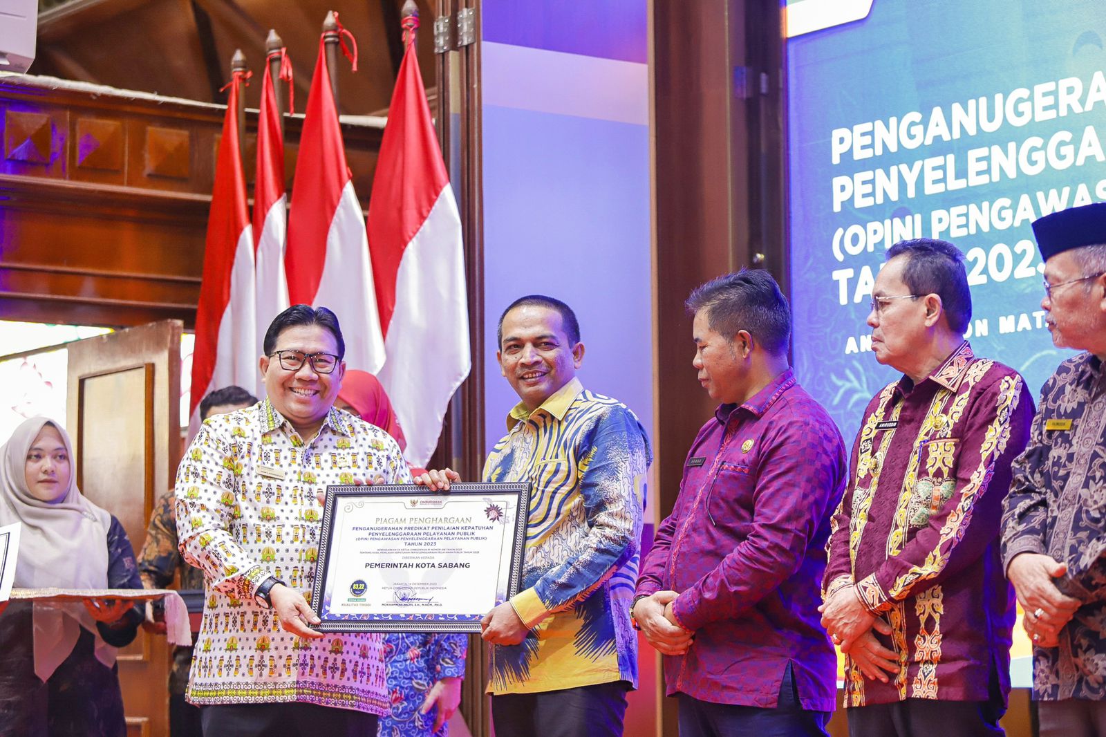 Piagam penghargaan tersebut diserahkan oleh Ketua Ombudsman RI Mokhammad Najih kepada Sekretaris Daerah Kota Sabang Andri Nourman, di Anjong Mon Mata Banda Aceh, Kamis (25/1).