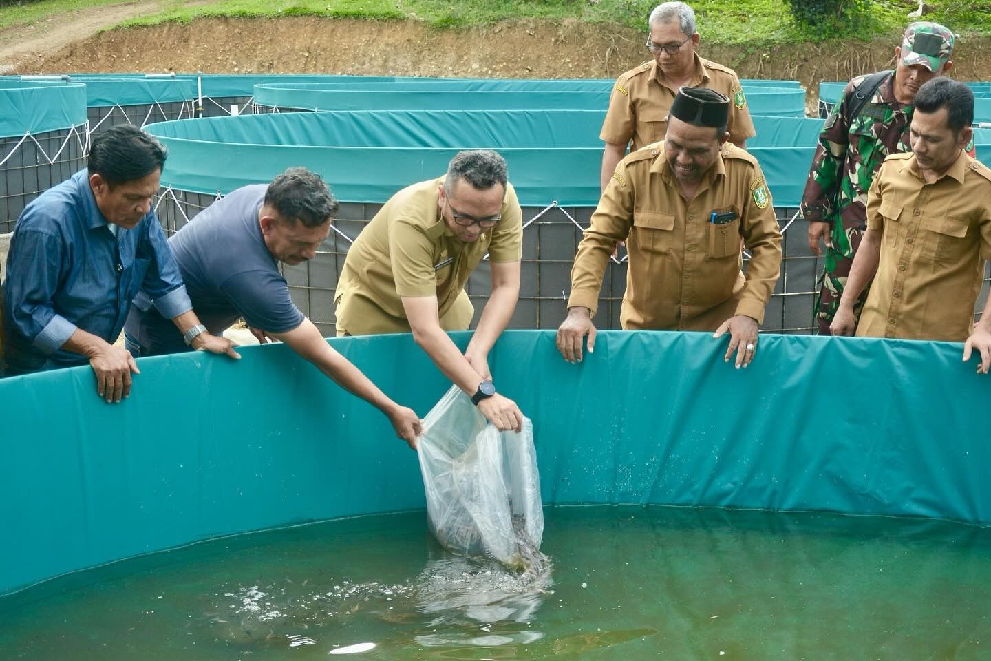 DISTORI.ID – Pj Wali Kota Sabang Reza Fahlevi bersama Gabungan Kelompok Tani (Gapoktan), tebarkan 24 ribu bibit lele di Gampong Paya Seunara.