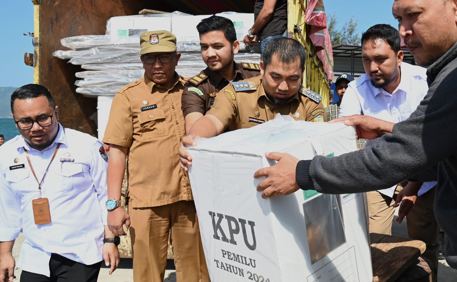 DISTORI.ID – Penjabat (Pj) Bupati Aceh Besar Muhammad Iswanto bersama unsur Forkopimda Aceh Besar, meninjau langsung distribusi logistik Pemilihan Umum (Pemilu) 2024 ke Kecamatan Pulo Aceh, Senin (12/02/2024).