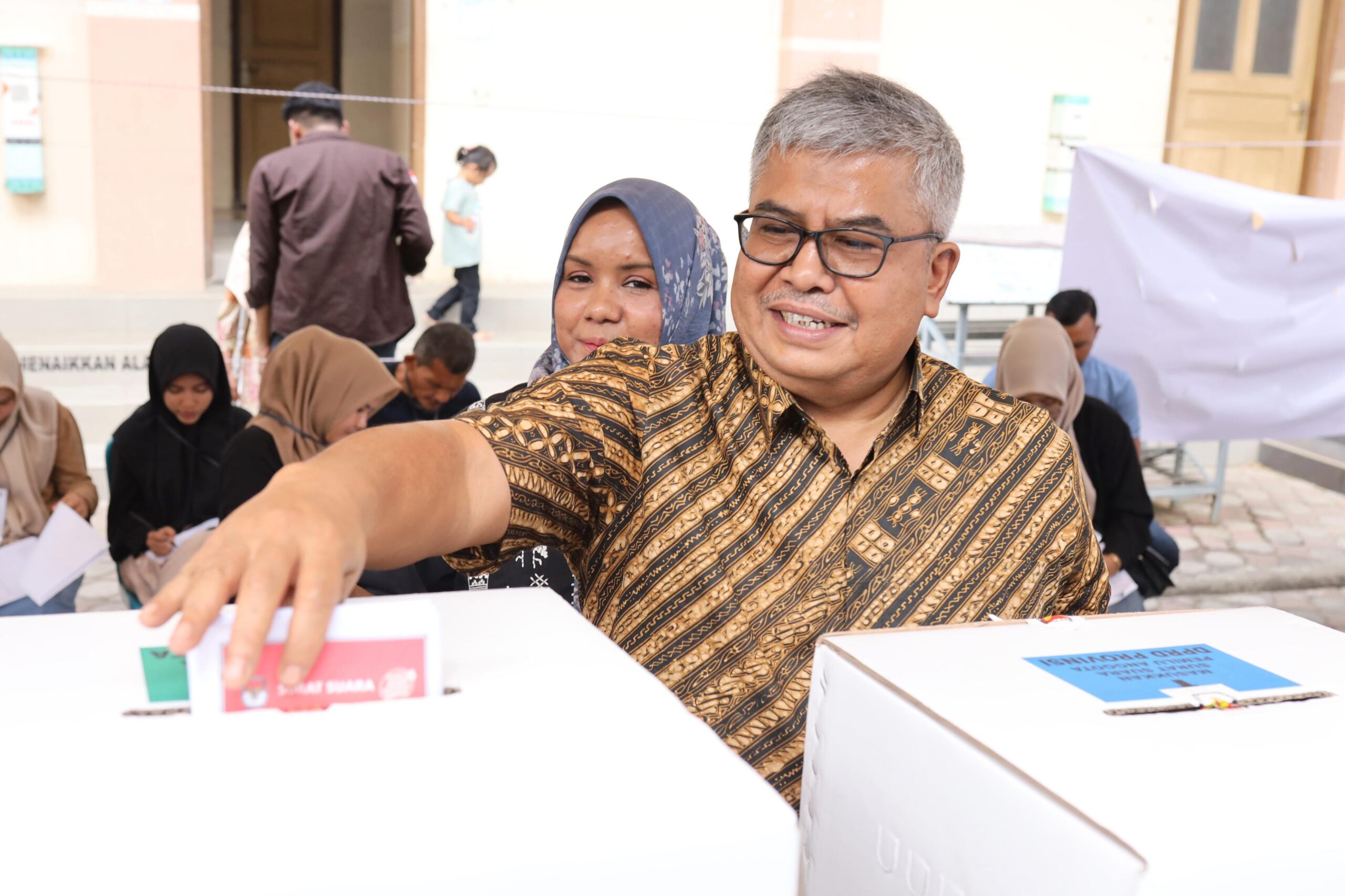 DISTORI.ID – Sekretaris Daerah (Sekda) Aceh, Bustami, bersama istrinya Mellani menggunakan hak suara di Pemilu 2024 di TPS 09 Masjid Darul Falah, Gampong Pineung, Kecamatan Syiah Kuala, Banda Aceh, Rabu (14/02/2024).