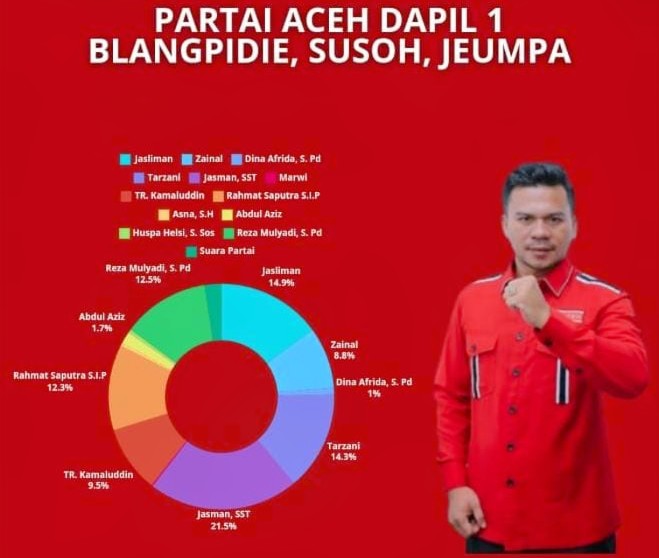 Dia berujar, untuk saat ini suara Partai Aceh yang direkap timnya sudah mencapai 3.500 lebih dan dapat dipastikan satu Kursi DPRK Dapil 1 Abdya milik Jasman sebagai peraih suara terbanyak.