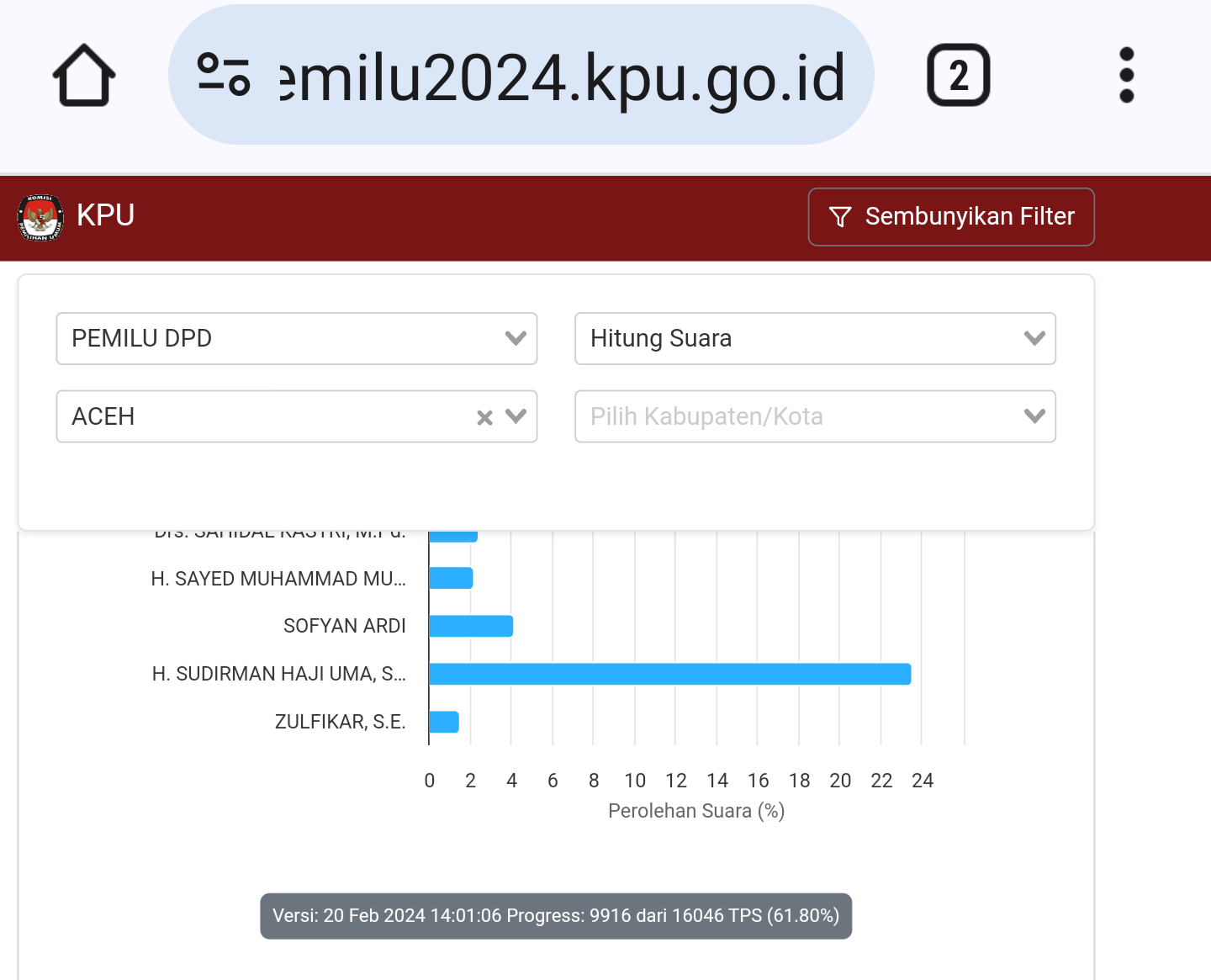 DISTORI.ID – Perolehan suara Sudirman Haji Uma calon anggota Dewan Perwakilan Daerah (DPD) RI dari Aceh berdasarkan hasil real count di website resmi KPU RI hingga Selasa, 20 Februari 2024 masih yang tertinggi.