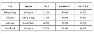 Berdasarkan SK Menteri PUPR terkait dengan penetapan tarif tol tersebut, berikut besaran tarif pada Tol Tebing Tinggi – Indrapura dan Tol Indrapura – Lima Puluh: