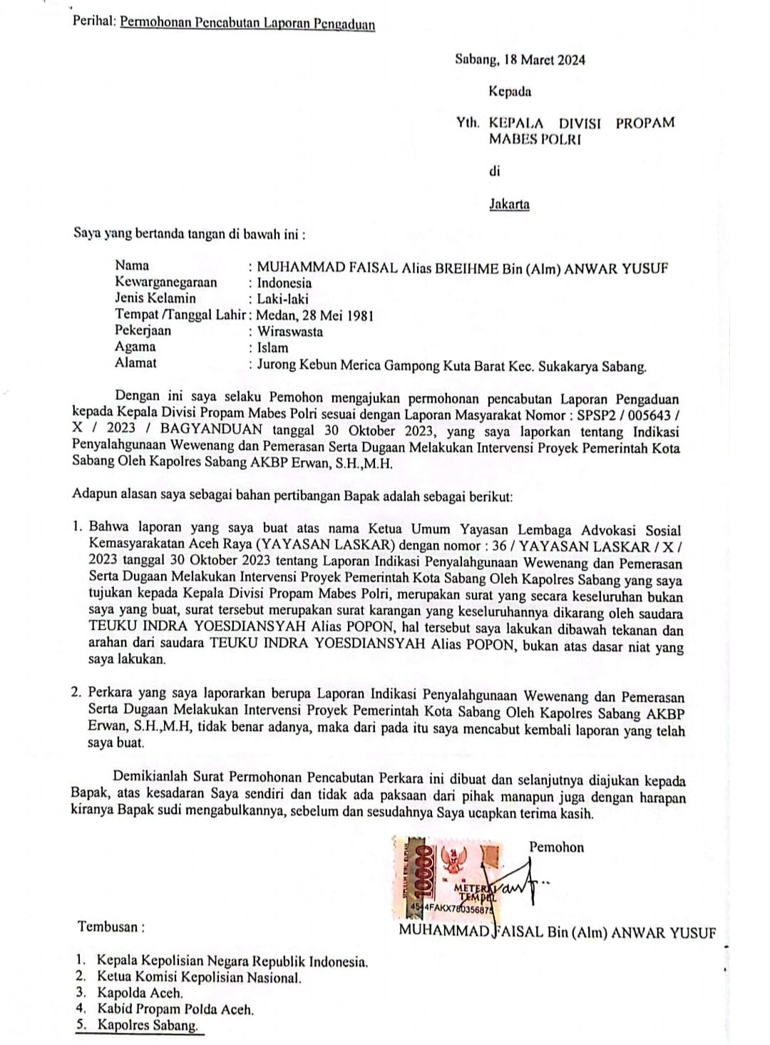 Oleh karena itu, atas kesadaran sendiri Faisal mencabut laporan tersebut. Ia membuat dan mengirimkan surat secara resmi kepada Kepala Divisi Propam Mabes Polri pada tanggal 18 Maret 2024 untuk mencabut laporan terhadap Kapolres Sabang AKBP Erwan. Surat tersebut dibuat dan ditandatangani atas meterai cukup.