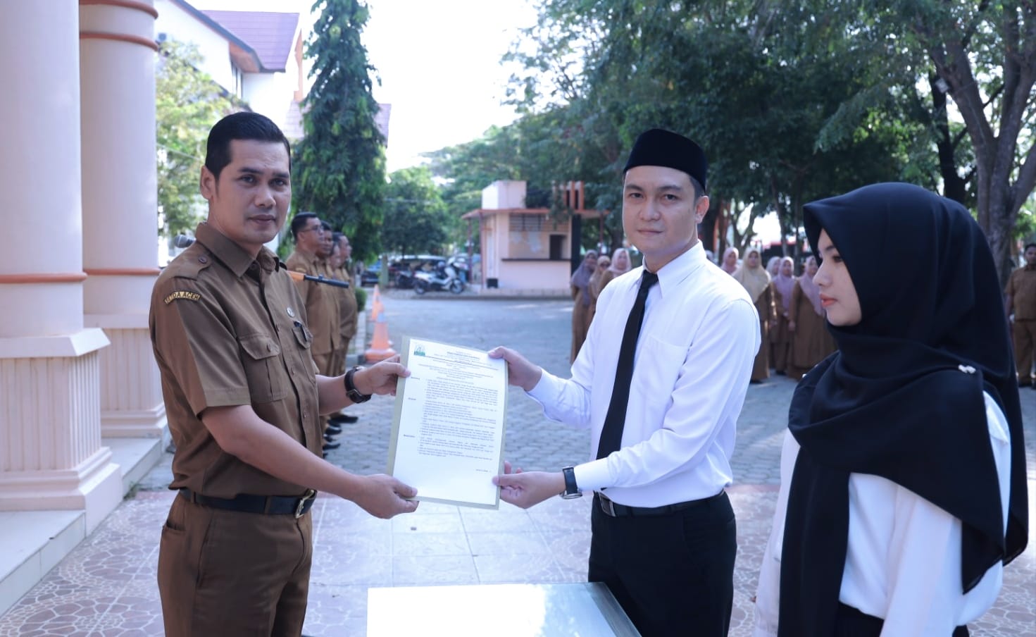 Sebelum penyerahan SK yang diwakili oleh dua orang Tenaga Kontrak, kegiatan yang berlangsung di Halaman Kantor Dispora Aceh, didahului dengan penandatangan pakta integritas.