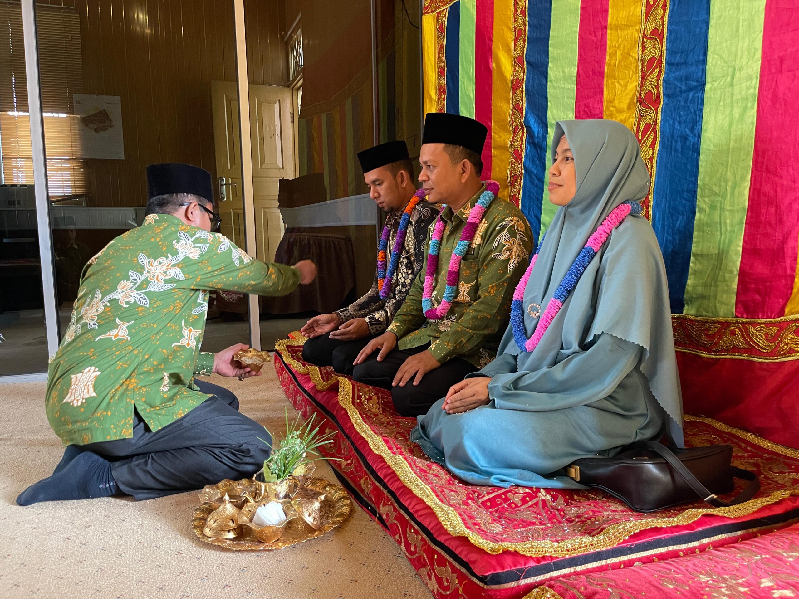 Kakankemenag Kabupaten Aceh Jaya Amirullah dan Kasubbag TU Saifullah serta ketua DWP Kemenag Aceh Jaya turut di-peusijuek (tepung tawar, red) dalam acara penyambutan tersebut.