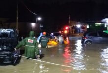 Selain itu, guna melakukan respon, tim gabungan juga melakukan evakuasi dan penanganan dengan menyisir daerah terdampak banjir untuk mengevakuasi warga yang masih terjebak banjir menggunakan perahu karet.
