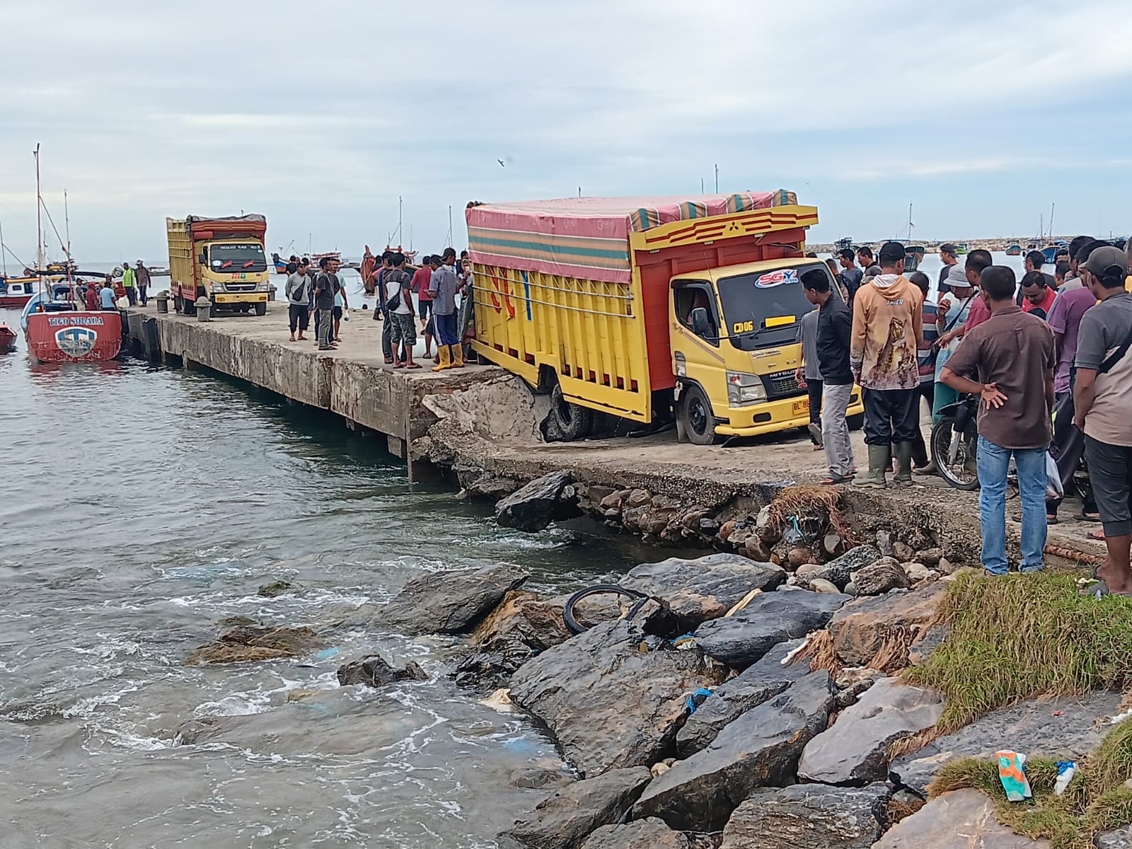 DISTORI.ID – Pelabuhan Pendaratan Ikan (PPI) Ujoeng Seurangga di Kecamatan Susoh, Kabupaten Aceh Barat Daya (Abdya) patah saat sedang dilintasi Dump Truck, Senin, 24 Juni 2024.