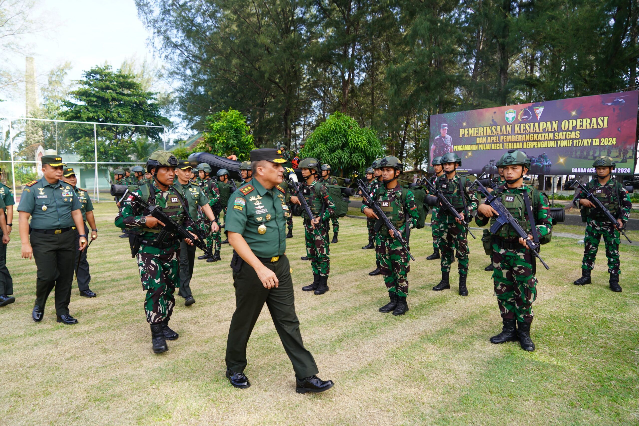 DSTORI.ID – Pangdam IM Mayjen TNI Niko Fahrizal, memimpin acara Pemeriksaan Kesiapan Operasi (Riksiapops) dan Apel Pemberangkatan Personel Satuan Tugas (Satgas) Pengamanan Pulau Kecil Terluar Berpenghuni Pulau Simeulue Cut Yonif 117/Ksatria Yudha yang berlangsung di Kompi Air, Bekangdam IM, Ulee Lheue, Kota Banda Aceh pada Kamis, (28/06/24).