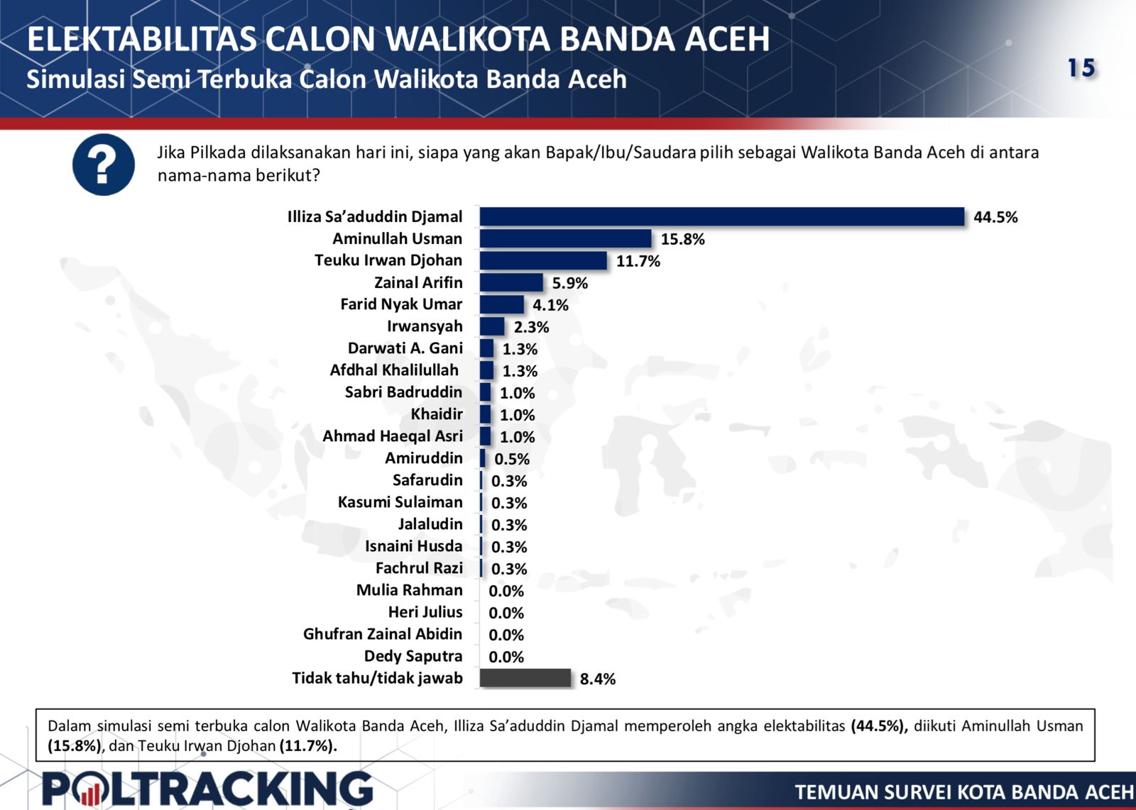 44.5 persen responden memilih Illiza Sa’aduddin Djamal, Aminullah Usman 15.8 persen dan Teuku Irwan Djohan 11.7 persen serta Zainal Arifin 5.9 persen. Persentase itu merupakan dominasi dengan 21 opsi calon.