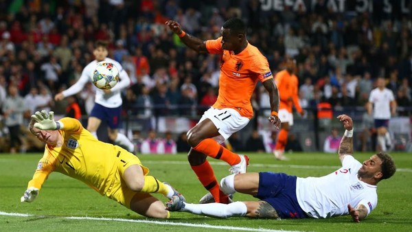 Tembakan Xavi Simons dari luar kotak penalti tak mampu dihentikan kiper Inggris Jordan Pickford.