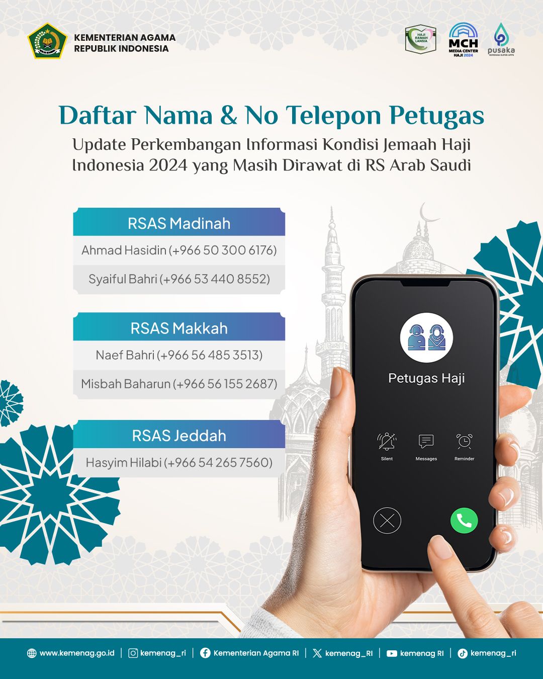 Berikut daftar nama PIC update perkembangan kondisi jemaah haji dirawat di Arab Saudi: