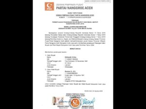 DISTORI.ID – Berdasarkan surat keputusan Dewan Pimpinan Pusat Partai Nanggroe Aceh (PNA) telah mengeluarkan surat persetujuan sesuai surat Nomor: 1.101/PNA/Pilkada/KU-SJ/VII/2024 kepada pasangan Salem (Safwandi-Muslem) sebagai pasangan Calon Bupati dan Wakil Bupati Aceh Jaya.