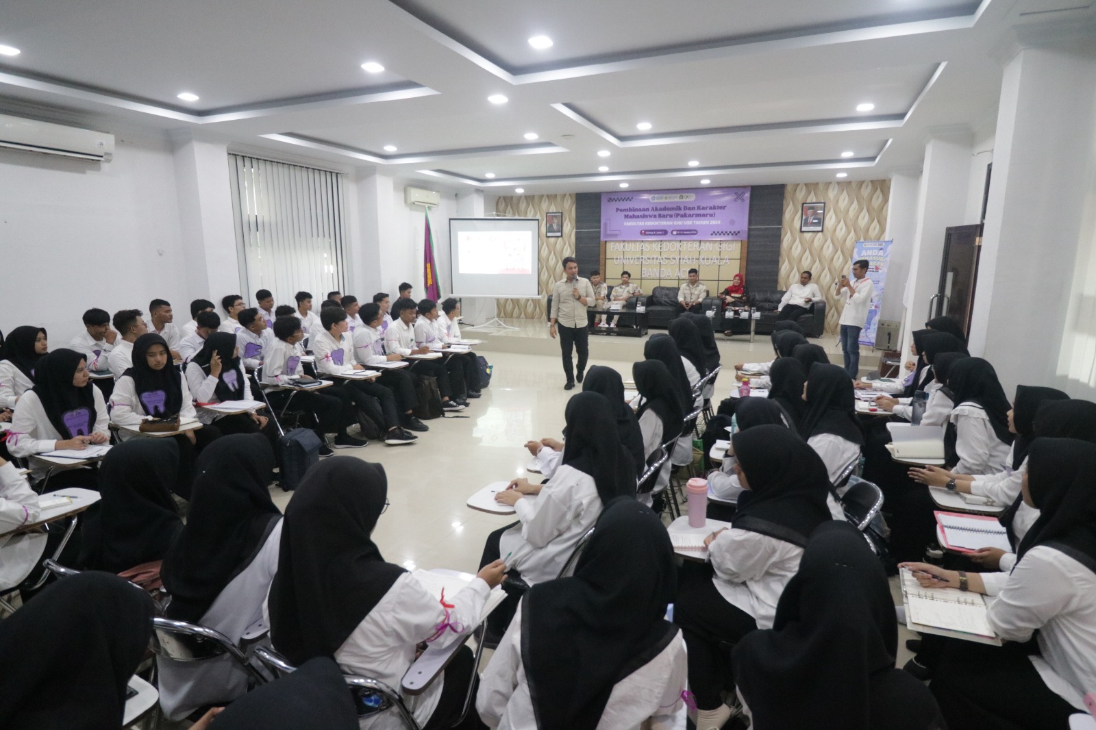 DISTORI.ID – Ketua Palang Merah Indonesia (PMI) Kota Banda Aceh, Ahmad Haeqal Asri, mengajak mahasiswa baru Fakultas Kedokteran Gigi Universitas Syiah Kuala (FKG USK) angkatan 2024 agar menjadi pendonor darah sukarela. Ajakan tersebut ia sampaikan dalam kegiatan Pembinaan Akademik dan Karakter Mahasiswa Baru FKG USK yang berlangsung pada Jumat (16/8/2024), di Aula Gedung A FKG USK, Banda Aceh.