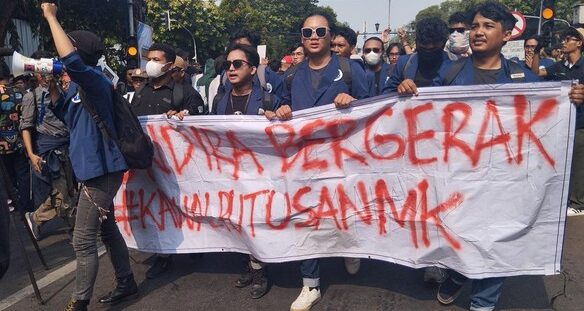 DISTORI.ID – Massa aksi Kawal Putusan Mahkamah Konstitusi (MK) mulai mendatangi kantor KPU RI di Jalan Imam Bonjol, Menteng, Jakarta Pusat. Massa terlihat menyampaikan orasi.