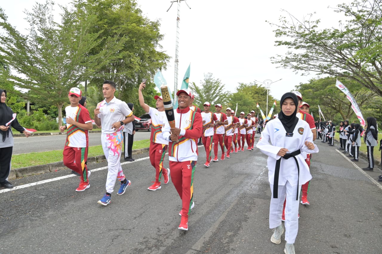 DISTORI.ID – Atlet legendaris Aceh Jaya Marwan Is, bawa obor Kirab Api PON XXI Aceh-Sumut 2024 di Lapangan Upacara Kantor Bupati Aceh Jaya, Selasa (27/8/2024). Kirab tersebut disambut oleh Penjabat Bupati Aceh Jaya A Murtala, bersama Forkopimda serta masyarakat setempat.
