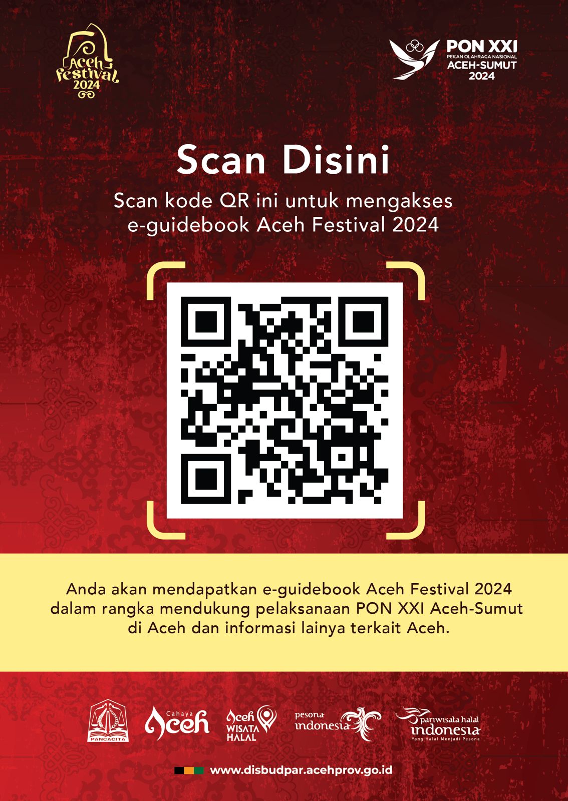 Bagi yang ingin mengetahui informasi secara lengkap beragam event Aceh Festival 2024 dan informasi lainnya, Anda dapat mendapatkan buku petunjuk/panduan digital (e-guidebook) pada barcode dan kanal dalam laman website  https://disbudpar.acehprov.go.id/ – https://acehtourism.travel/ serta platform digital terkait.
