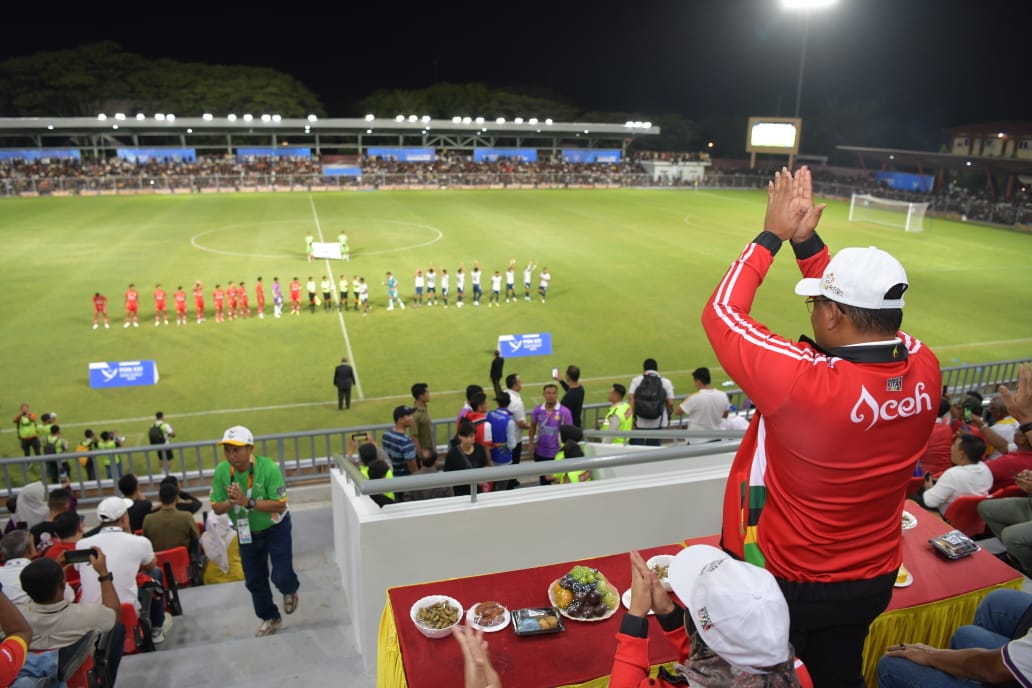 Penjabat (Pj) Gubernur Aceh, Safrizal, yang hadir menyaksikan pertandingan dari tribun utama, terlihat antusias mendukung tim Aceh sepanjang laga. Safrizal, yang ditemani istrinya serta sejumlah kepala Satuan Kerja Perangkat Aceh (SKPA), tak henti-hentinya memberikan semangat kepada para pemain.
