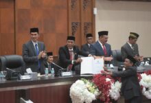 DISTORI.ID – Bakal Pasangan Calon (Bapaslon) Wali Kota dan Wakil Wali Kota Banda Aceh menandatangani surat pernyataan bersedia menjalankan butir-butir Memorandum of Understanding (MoU) Helsinki dan Undang-Undang Pemerintah Aceh (UUPA) di Gedung Rapat Paripurna Dewan Perwakilan Rakyat Kota (DPRK) Banda Aceh, Jumat (6/9/2024).