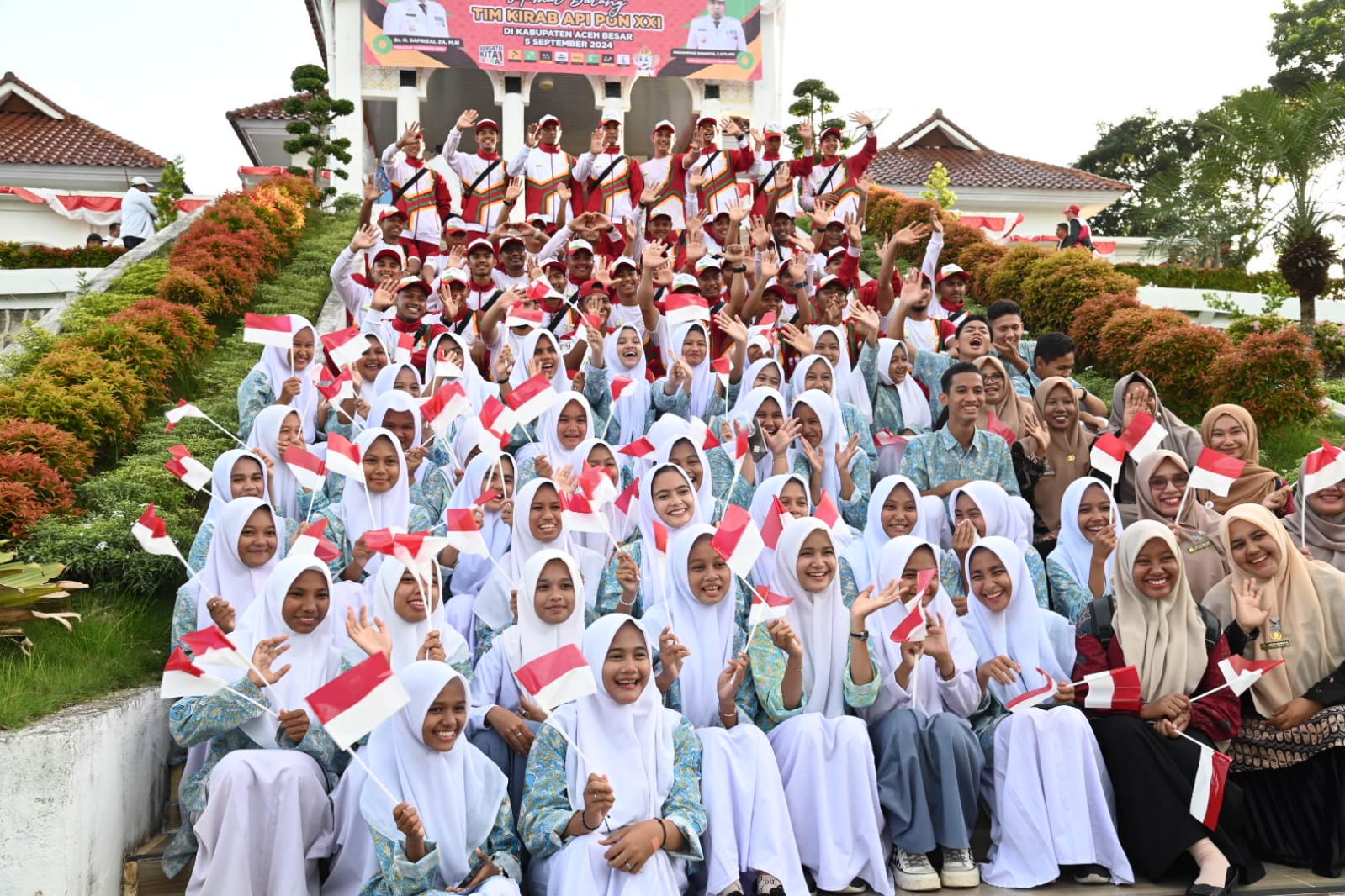 DISTORI.ID – Tim kirab api Pekan Olahraga Nasional (PON) XXI Aceh – Sumut disambut meriah oleh seribuan pelajar, warga dan para Aparatur Sipil Negara (ASN) dengan kibar bendera merah putih di Ibu Kota Kabupaten Aceh Besar, Kota Jantho.