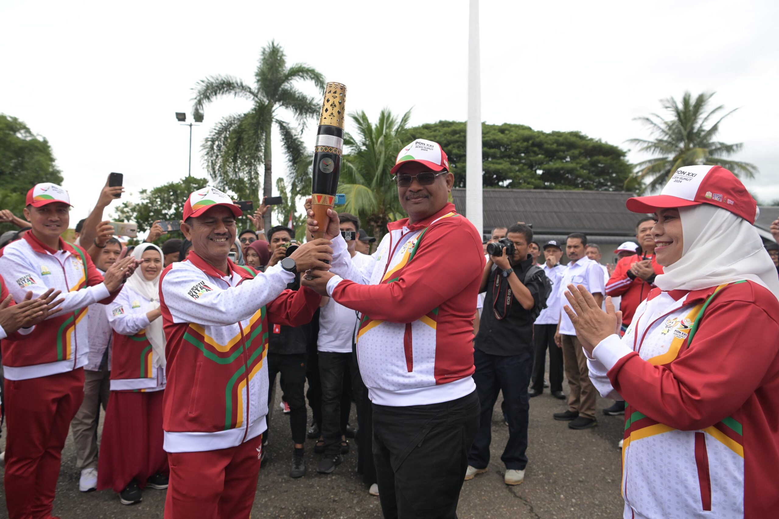 DISTORI.ID – Penjabat (Pj) Wali Kota Banda Aceh Ade Surya, menyerahkan Obor Api PON XXI kepada Pj Gubernur Aceh Safrizal, di Meuligoe Gubernur Aceh, Banda Aceh, Sabtu (7/9/2024). Setelah diinapkan, obor tersebut akan kembali dikirab ke Stadion Harapan Bangsa (SHB), Banda Aceh pada malam pembukaan, Senin (9/9/2024).