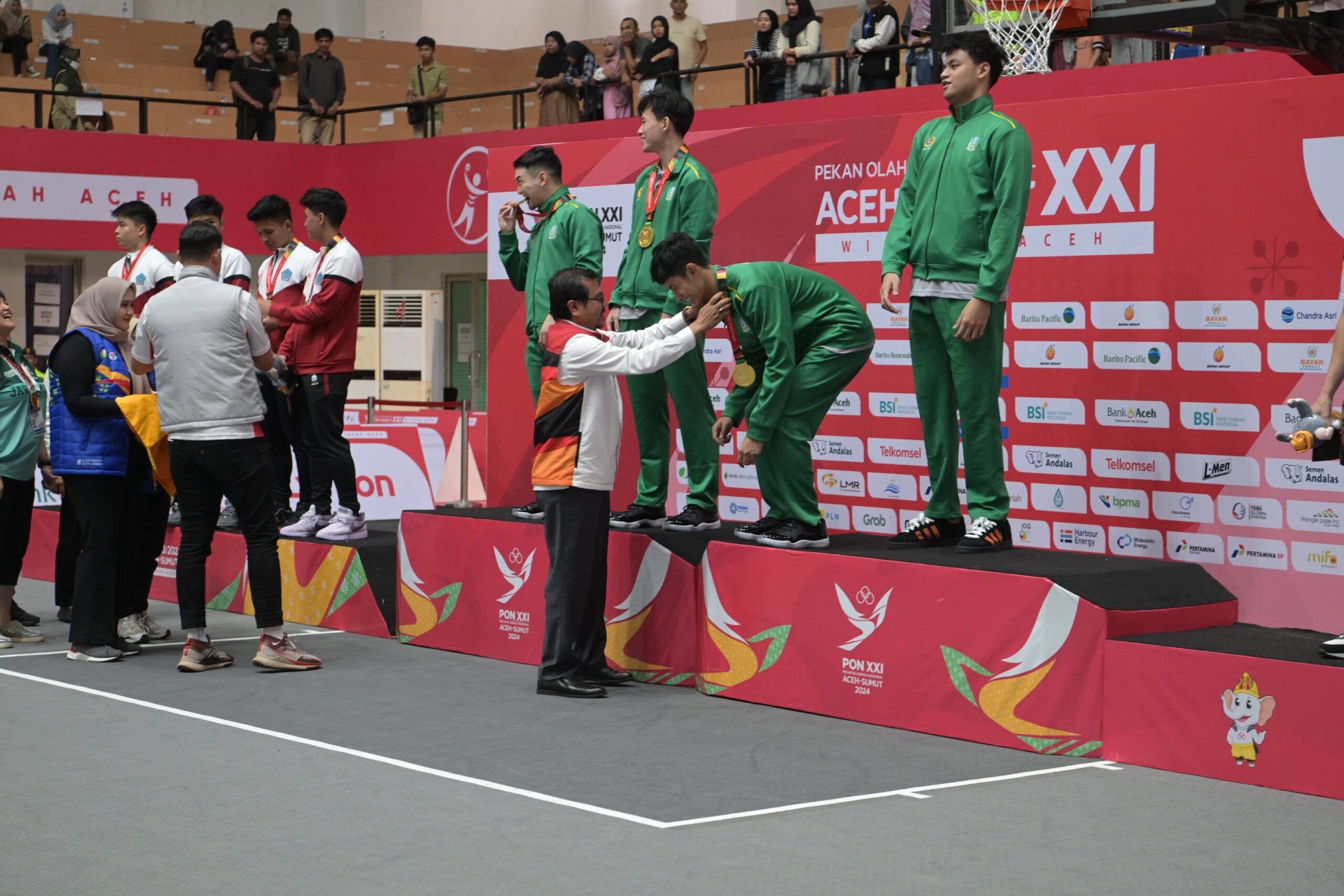 DISTORI.ID – Pelaksana harian (Plh) Sekda Aceh, Azwardi, menyerahkan medali emas kepada para atlet yang memenangkan cabang olahraga bola basket 3×3 dalam ajang PON XXI Aceh-Sumut.